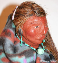 The necklace and earrings are made from turquoise stones and silver beads. Her hair barrettes are Native American beaded from glass beads and the hair is horse hair.